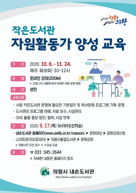 의왕시 내손도서관은 오는 17일부터‘작은도서관 자원활동가 양성 교육’강좌 신청을 받는다.