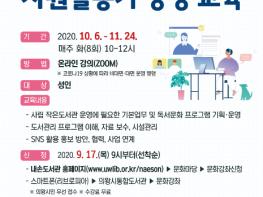교육대상은 작은도서관 자원봉사에 관심 있는 시민 누구나 참여 가능하며, 수강료는 무료이다. 총 8회 진행되는 강의는 ▲작은도서관 운영에 필요한 기본업무 및 독서문화 프로그램 기획?운영 ▲도서관리 프로그램 이해, 자료 보수, 시설관리 ▲SNS 활용 홍보 방안, 협력, 사업 연계 등에 대한 강의가 준비되어 있다.