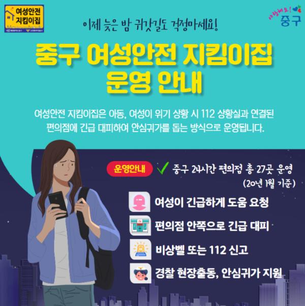 대전 중구(구청장 박용갑)는 여성친화도시 기반 조성 사업으로 관내 24시 편의점 10곳에 야간 범죄에 취약한 여성들을 위한 여성안전 지킴이집을 추가 설치했다.