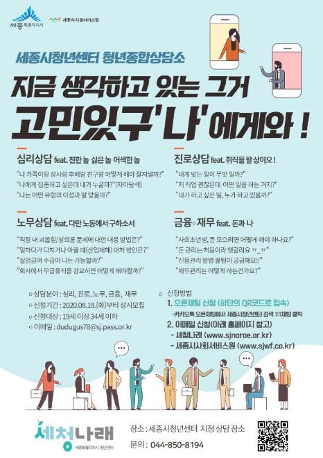 세종특별자치시 청년센터 세청나래가 관내 청년들의 심리, 진로, 학업, 취업, 직장문제, 금융문제, 체불임금 등 다양한 분야 고민해결을 위한 ‘청년종합상담소’를 운영한다.