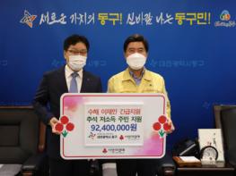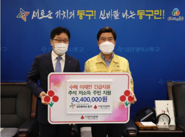 이날 대전사회복지공동모금회는 동구에 추석명절 지원사업과 긴급지원 사업의 지원사업비를 전달했으며 전달된 지원사업비는 추석명절 지원사업비 2040만 원과 긴급지원 사업비 7200만 원으로 총 9240만 원이다.