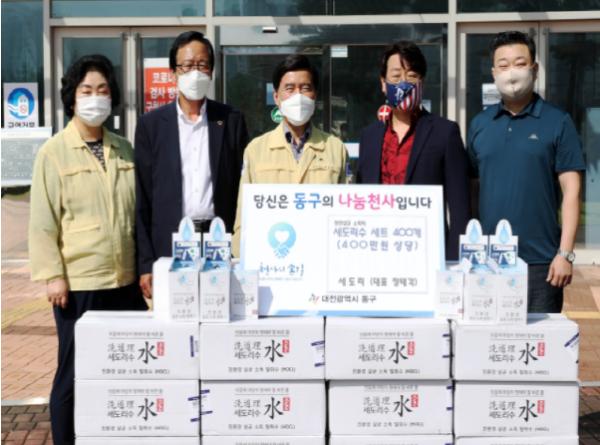 대전시 동구(구청장 황인호)는 15일 구청 광장에서 ㈜세도리 바이오닉스(대표 장태각)의 천연살균 소독제 기탁식을 가졌다고 밝혔다.