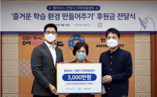 후원금 전달식은 15일 김덕영 펄어비스 인사문화실장, 설미경 안양시지역아동센터연합회장, 이진수 안양시부시장이 함께한 가운데 있었다.