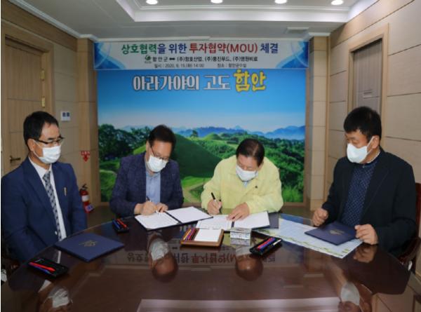 함안군은 지난 15일 오후 2시 군수실에서 ㈜풍진푸드·(주)청호산업·(주)영원비료와 대산장암농공단지 내 기업체를 유치하기 위한 투자협약(MOU)을 체결했다.