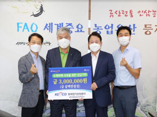 한국전기안전공사 대전세종충남지역본부(본부장 최덕기)는 지난 15일 금산군청을 찾아 금산 수해피해 극복을 위한 성금 300만 원을 기탁했다.