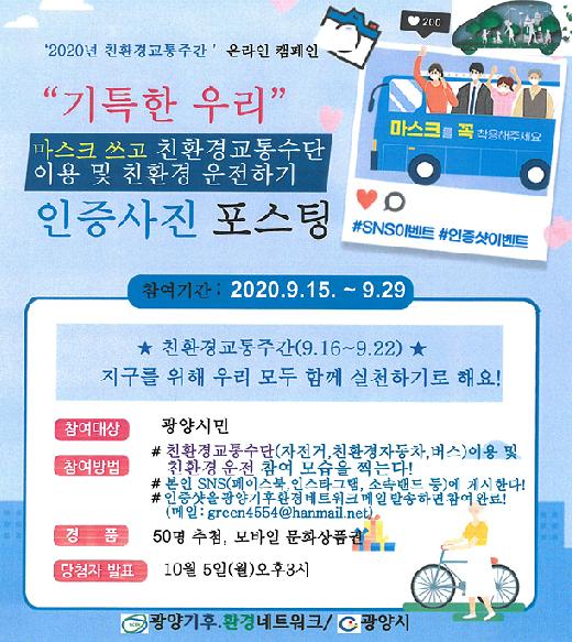 광양시는 광양기후환경네트워크와 함께 시민을 대상으로 ‘2020년 친환경 교통주간’ 온라인 캠페인을 오는 29일까지 시행한다고 16일 밝혔다.