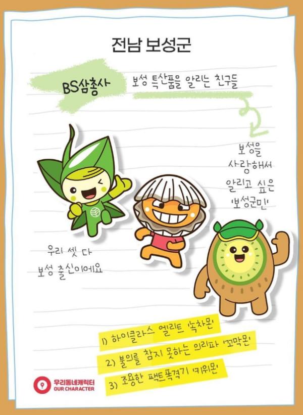 제3회 우리동네 캐릭터 대상에 출전한 보성군 특산품 캐릭터 BS삼총사가 군단위에서는 유일하게 본선에 진출했다.