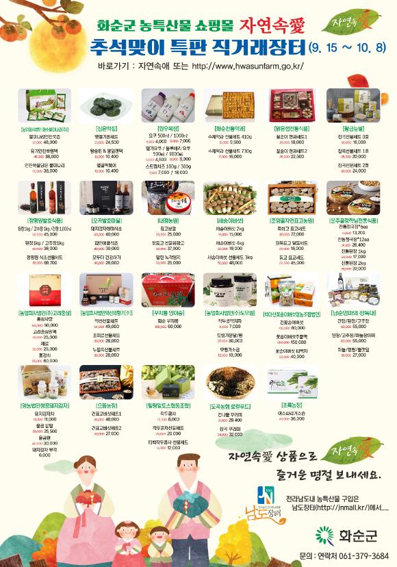 화순군(군수 구충곤)이 코로나19 장기화 등으로 농특산물 판매에 어려움을 겪고 있는 농가의 안정적인 판매망 구축을 위해 추석맞이 온라인 직거래 장터를 개장한다.
