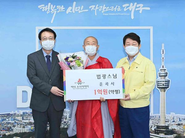 법광스님은 “나의 작은 기부가 마중물이 되어 희생과 보시의 따뜻한 마음이 대구 곳곳에 퍼져나갔으면 한다”며 “전달된 성금이 우리지역에 도움이 꼭 필요한 이웃들에게 잘 전달되길 바란다”고 전했다.