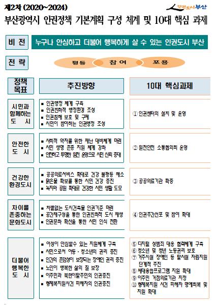 부산시는 ‘누구나 안심하고 더불어 행복하게 살 수 있는 인권 도시 부산’을 비전으로 하는 「제2차 부산광역시 인권정책 기본계획」을 수립했다고 밝혔다.