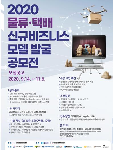 인천창조경제혁신센터와 한진이 공동 주관하고, 국토교통부가 후원하는「2020 제6회 스마트물류 창업공모전 (2020물류·택배 신규 비즈니스 모델 발굴 공모전)」의 모집이 9월 14일부터 시작됐다.