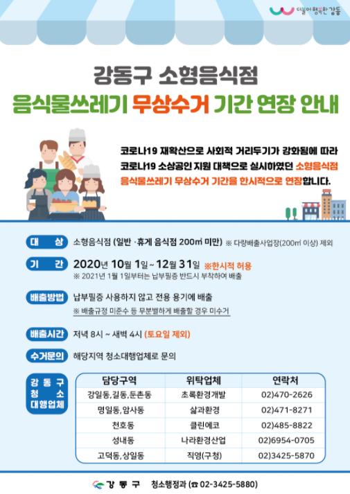 강동구(구청장 이정훈)가 소형음식점 음식물쓰레기 무상 수거 기간을 당초 이달 말에서 오는 12월 31일까지로 3개월 더 연장한다.
