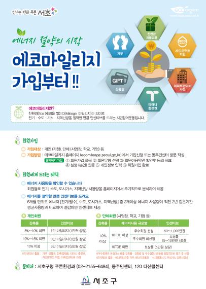 에코마일리지 가입을 희망하는 가정(개인) 및 단체는 에코마일리지 홈페이지를 통해 인터넷으로 가입하거나, 서초구청 푸른환경과(☏2155-6467) 및 가까운 동주민센터에 방문하여 신청하면 된다.