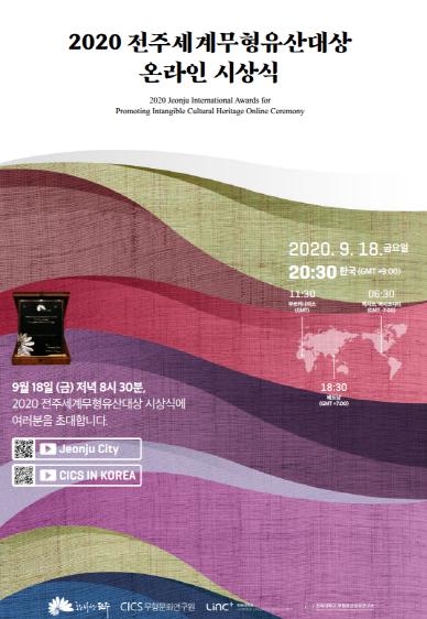 코로나19 여파로 비대면 방식으로 열리는 이날 시상식 영상은 전주시청 유튜브 채널과 전주시 홈페이지(jeonju.go.kr), 전주세계무형유산대상 홈페이지(jiapich.org) 등에서 볼 수 있다.