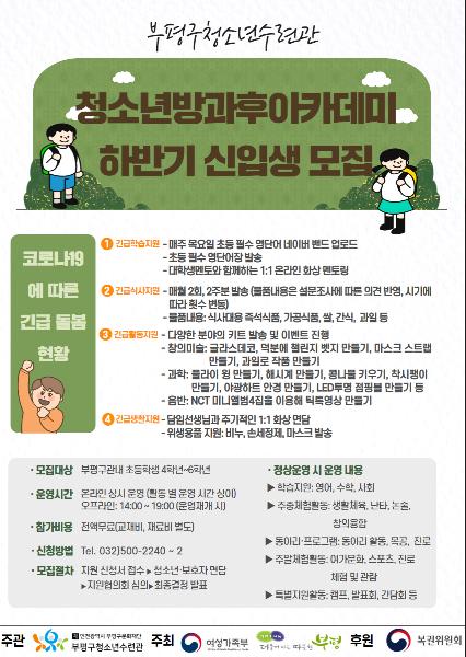 부평구(구청장 차준택)청소년수련관 청소년방과후아카데미는 17일 긴급돌봄서비스 형태로 진행하는 ‘2020년 하반기 신입생’을 모집한다.