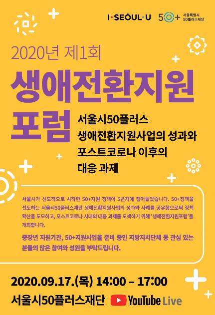 서울시50플러스재단(대표이사 김영대)은 지난 4년 간 추진해 온 중장년 생애전환사업의 성과와 사례를 공유하고 향후 발전 방향을 모색하기 위한 ‘제1회 생애전환지원 포럼’을 17일(목) 온라인으로 개최했다.