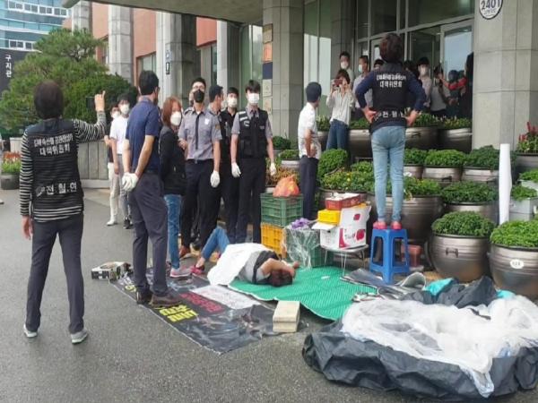 특히 1년 가까이 계속되는 집회차량 스피커 방송과 확성기 등을 통한 고성과 몸싸움에 코로나, 태풍 등으로 인한 각종 비상근무까지 겹친 시청 직원들 중 일부는 두통과 스트레스를 호소하고 있다.