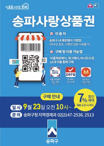 이번 송파사랑상품권은 7% 할인된 금액(월 70만원 구매한도)으로 총 80억 원이 발행된다. 스마트폰 간편결제앱(비플제로페이, 체크페이, 머니트리 등 총 14개 어플)을 통해 본인인증 및 결제계좌 등록 후 구매 가능하고 사용방법은 제로페이 결제와 동일하다.