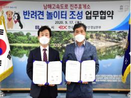 반려견 놀이터는 기존 진주휴게소 내 반려견 놀이터를 확장하여 부지 5000m2 규모로 소형견, 중·대형견이 분리된 반려견 놀이공간, 음수시설, 휴게시설 및 관리실 등을 조성하며 내년 하반기 준공 예정이다.