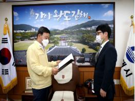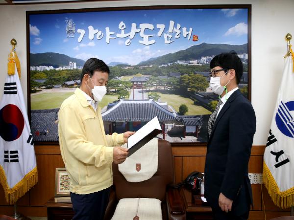 2020 독서문화진흥 정부포상은 지난 5월 전국적으로 단체와 개인을 포함한 후보자를 추천받아, 7월 공개검증을 거친 후 8월 마지막 날 대통령표창 1, 국무총리상 3, 장관표창 20명의 수상자를 발표하였으나 코로나 19로 인해 시상식이 제대로 열리지 못해 9월 17일(목) 시장실에서 허성곤 김해시장의 전수로 다시 수여되었다.