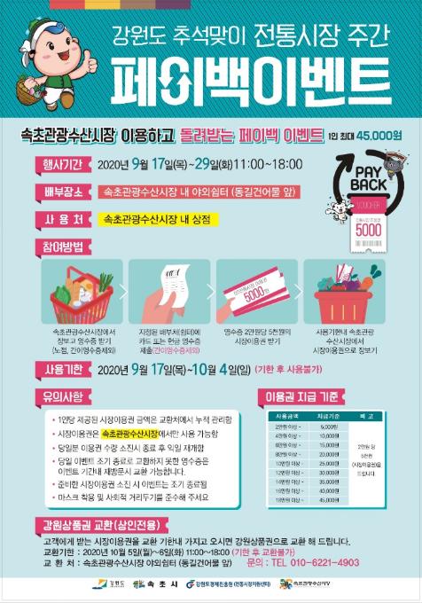 속초시는 코로나19로 어려움을 겪고 있는 전통시장 상권 활성화를 위하여 9월 17일부터 10월 4일까지 추석맞이 페이백 행사, 장보기 행사 등 다양한 이벤트를 실시한다.