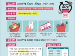 우선, 추석을 맞이하여 전통시장에서 장보는 고객들을 위하여 전통시장 페이백 이벤트를 9월 17일부터 9월 29일까지 13일간 진행한다. 2만원 이상 물품을 구매하면 5,000원 상당의 시장이용권을 제공하고, 1인 최대 45,000원까지 가능하며 제공받은 시장이용권은 추석명절 기간 마지막 날인 10월 4일까지 사용가능하다.