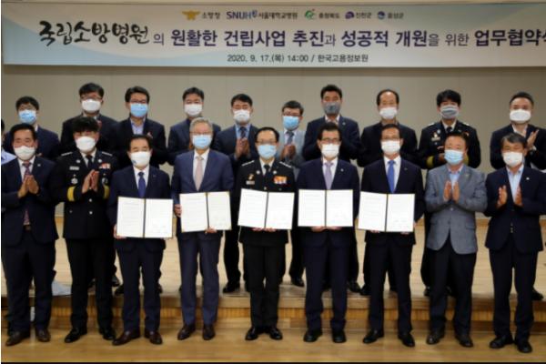 충청북도는 소방청, 서울대병원, 음성군, 진천군과 함께 충북혁신도시에 건립될 ‘국립소방병원 건립사업(舊 소방복합치유센터 명칭 변경*)’의 성공적 추진을 위해 9월 17일(목) 14시 한국고용정보원에서 업무협약식을 가졌다.