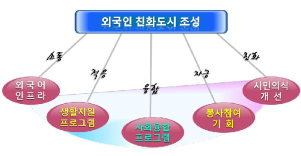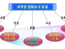 또한, 외국인의 빠른 사회융합을 돕기 위해 외국인 커뮤니티센터 운영과 외국인 문화·스포츠 동호회 활성화, 외국인 테마거리 조성 등을 추진한다. 아울러, 사회 구성원의 일원으로 자립해나갈 수 있도록 무료 외국어교실 강사 참여, 모국어 SNS를 통한 외국어 시정 홍보 등 봉사활동에 참여할 기회를 적극 제공할 계획이다.