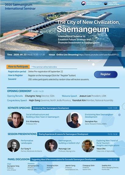새만금개발청(청장 양충모)은 (사)한국도시설계학회(회장 이제선)와 함께 재정비 중인 새만금 기본계획에 국내외 전문가들 및 국민의 의견을 반영하기 위해 9월 23일 「2020 새만금 국제세미나」를 개최한다고 밝혔다.