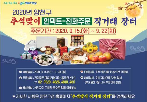 양천구(구청장 김수영)가 추석맞이 직거래 장터를 이달 15일부터 24일까지 개장한 다고 밝혔다.