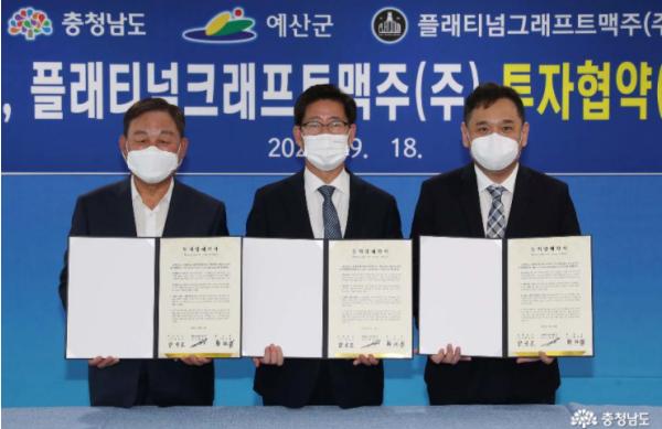 양승조 지사는 18일 도청 상황실에서 배문탁 플래티넘크래프트맥주 대표이사, 황선봉 예산군수와 투자협약(MOU)을 체결했다.