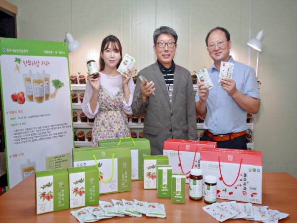 충주시 농업기술센터(소장 정진영)가 농산가공 기술 상품화 시험연구사업의 성과로 충주사과와 새싹인삼을 혼합한 ‘한뿌리 삼사과’음료를 개발해 본격적인 생산 및 판매에 들어갔다.