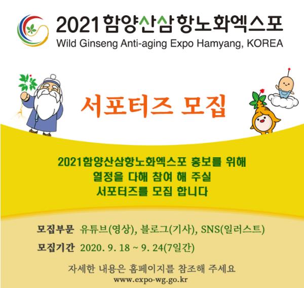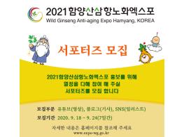 함양산삼항노화엑스포조직위원회(위원장 김경수)는 24일까지 ‘2021 함양산삼항노화엑스포’ SNS 서포터즈(기자단)을 모집한다고 밝혔다.