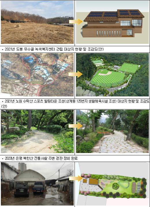 강북구는 △진달래마을 커뮤니티숲 공원조성, 은평구는 △북한산 전통사찰 주변 경관 정비, 구로구는 △천왕동 연지마을 소공원 조성 △개웅산 자락길 조성, 금천구는 △시흥계곡 생태공원 조성, 강동구는 △암사역사공원조성 △진황도로 확장공사를 추진하고 있다.