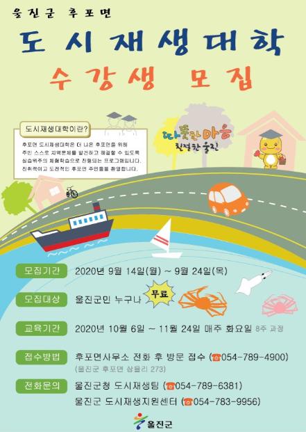 후포면 도시재생대학 수강료는 무료이며, 울진군민이라면 누구나 신청가능하다.