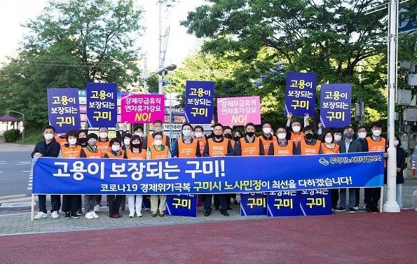 구미시 노사민정협의회는 지난 4월 28일(화) 11:00 구미시 근로자권익 지원센터에서 코로나19로 인한 지역경제 위기극복과 고용안정을 위한 「구미시 노ㆍ사ㆍ민ㆍ정 상호협력 공동선언문」을 선포했다.