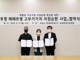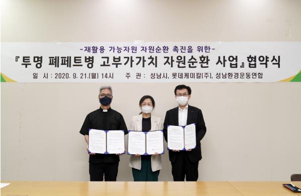 성남시가 9월 21일 민·관·기업 투명 폐페트병 자원 순환 확대를 위한 업무협약을 롯데케미칼(주), 성남환경운동연합과 체결했다.