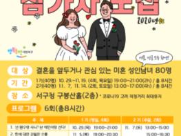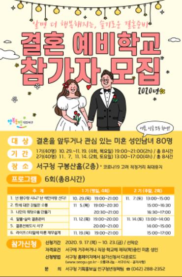 대전시 서구(구청장 장종태)는 미혼남녀를 대상으로 서로를 이해하고 행복한 결혼생활을 위해 『알면 더 행복해지는 슬기로운 결혼 준비, 서구 결혼 예비학교』 대상자를 다음 달 23일까지 모집한다.