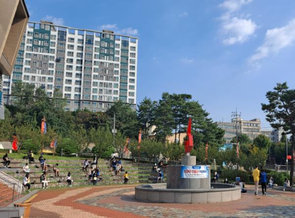 청명한 가을하늘 아래 아트홀 공연장 앞 계단, 분수광장 옆 바닥, 벤치 의자에 앉아서 면 행주를 한땀 한땀 완성해가는 학생들의 바느질하는 모습이 즐거워 보였다.