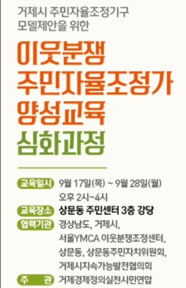 한편, 거제시와 거제경실련은 오는 28일에 거제시청 소통실에서 이웃분쟁주민자율조정가 양성교육 심화과정 수료자를 대상으로 수료식을 개최하고 마을소통방 운영을 위한 네트워크를 발족해 마을소통방 운영방안을 논의할 예정이다.