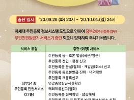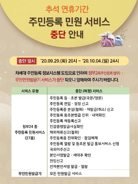 추석연휴 기간 중단 되는 민원서비스는 정부24(주민등록 업무) 27종과 무인민원발급 서비스이며 관내 46개소 무인민원발급기를 포함한 전국 무인민원발급기가 대상이다.