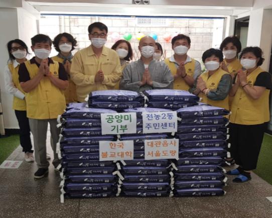 서울 동대문구 전농2동 주민센터(동장 김철수)는 대한불교조계종 한국불교대학 大관음사 서울도량(주지 인호)가 21일(월) 코로나19로 물리적, 심리적 어려움을 겪고 있는 이웃을 위로하고 그들에게 보탬이 되고자 공양미 70포(각 10kg, 2백10만 원 상당)를 기탁했다고 밝혔다.