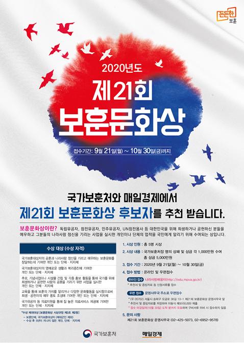 국가보훈처(처장 박삼득)는 대한민국을 위해 희생·공헌하신 분들을 예우하고, 보훈문화 확산에 기여한 개인과 단체에 시상하는 2020년도 ‘제21회 보훈문화상’후보자 접수를 시작한다고 밝혔다.