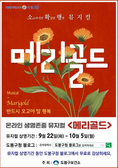 도봉구(구청장 이동진)는 오는 9월 22일부터 10월 5일까지 14일 간 코로나19로 지친 구민들의 코로나블루 해소를 위해 생명존중 뮤지컬 ‘메리골드’를 온라인 상영한다.