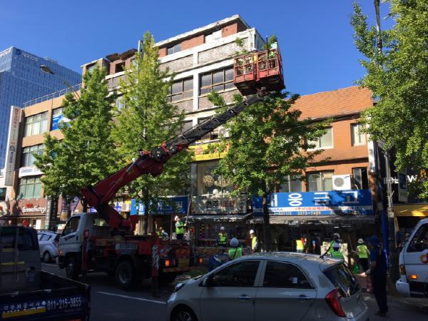 작업은 구 직영 기동반과 구와 계약한 전문 업체가 구역을 나눠 움직인다. 고소작업차를 이용한 작업은 주로 간선도로변에서 실시하고 차량 진입이 어려운 곳은 기동반이 투입돼 수작업을 펼친다.