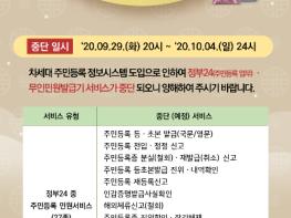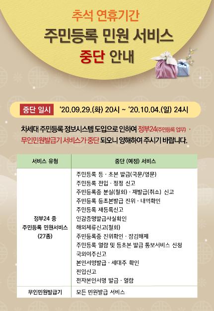 시는 추석연휴 기간인 오는 29일 오후 8시부터 10월 4일 밤 12시까지 차세대 주민등록정보시스템 전환 작업을 위해 주민등록 관련 민원서비스를 전면 중단한다고 23일 밝혔다.