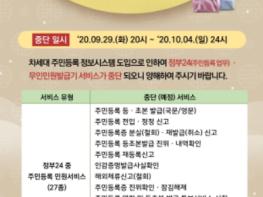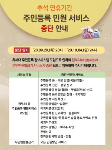 추석기간 중단되는 서비스는 정부24를 통한 온라인 주민등록관련 서비스 27종이며, 무인발급기는 모든 민원발급 서비스가 중단된다.