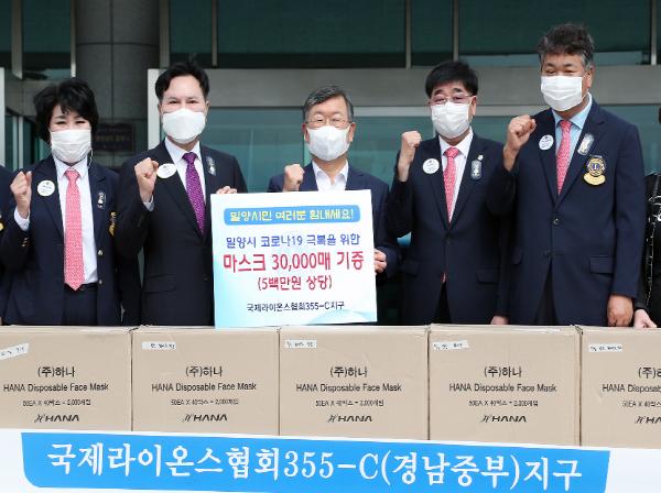 국제라이온스협회 355-C 지구(총재 신기일)는 23일 밀양시청을 방문해 어려운 이웃에게 전달해 달라며 마스크 30,000장(500만원 상당)을 기탁했다.