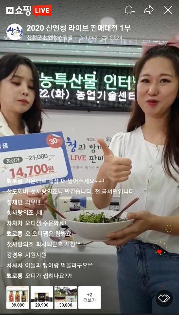 군은 지난 22일 오후 7시부터 10시까지 ‘네이버 쇼핑라이브’에서 ‘산엔청 라이브커머스 판매대전’을 진행했다.