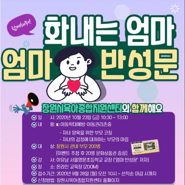 창원시육아종합지원센터(센터장 변정순)는 오는 10월 23일 오전 10시 30분 ‘엄마 반성문’ 저자 이유남 작가를 초청하여 비대면 자녀 양육 강연과 상담을 실시한다고 23일 밝혔다.